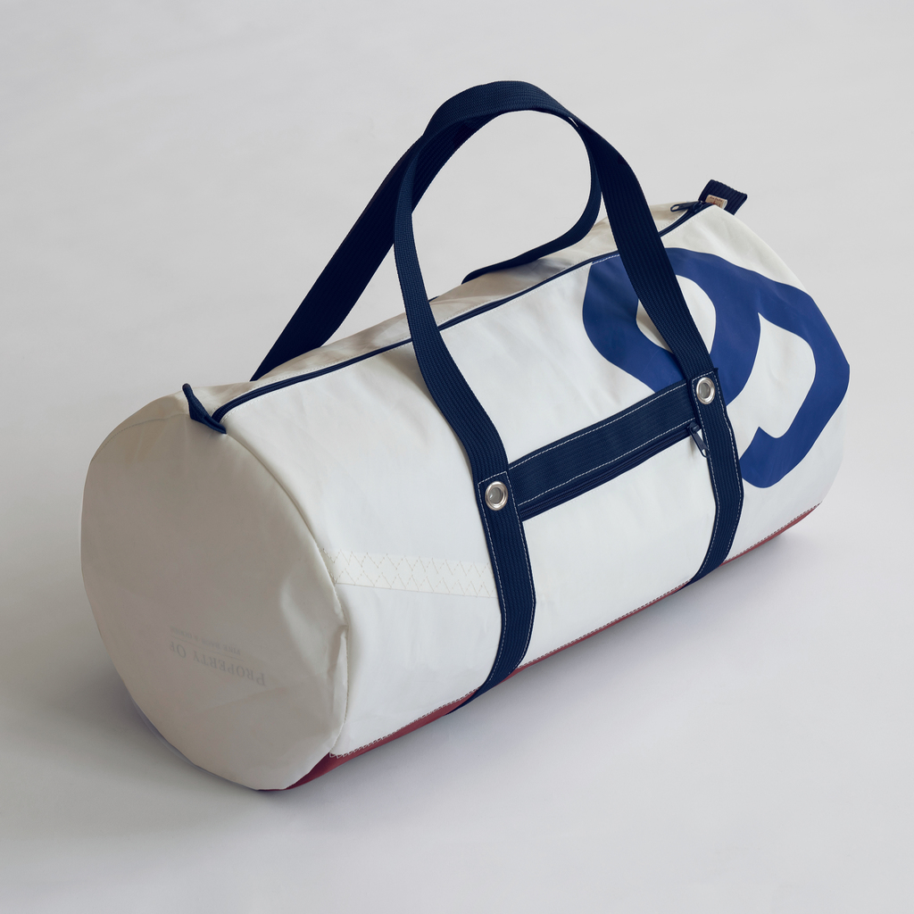Diese robusten, wasserfesten Taschen entstehen in der Provence aus echten, ausgedienten Segeln, die nicht mehr seetauglich repariert werden können. Dank des verwendeten Hochleistungsgewebes sind sie für stabile und langlebige Sporttaschen das ideale Material. Seit 2007 werden auf diese Weise pro Jahr mehrere Tausend Quadratmeter Segelfläche einer neuen Bestimmung zugeführt. Eigens für uns produziert man Taschen mit mehr oder weniger identischem Aussehen – Wert und Position der Segelnummern sind ansonsten völlig zufällig. Dennoch ist jede Tasche ein individuelles Einzelstück. Zylindrische Form mit Reißverschluss, verstärktem Boden, stabil vernieteten Tragegurten, kleiner Außentasche und separatem Innenfach.