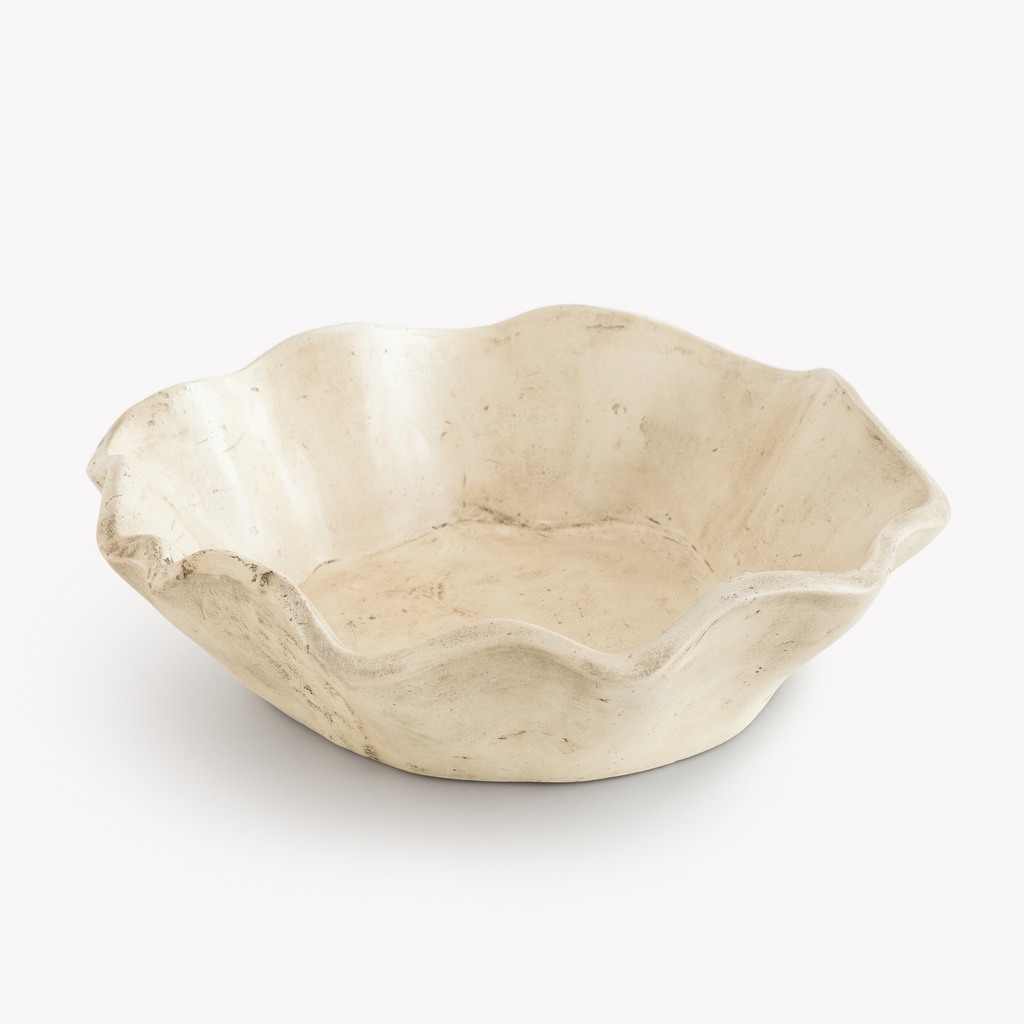 Das helle Antikfinish verleiht dieser massiven Schale aus Terrakotta die Anmutung natürlich gealterten Travertins. Jede Schale wird von Hand gearbeitet – der schwungvolle Wellenrand fällt dabei stets ein wenig anders aus und macht das Gefäß – leer oder gefüllt – zum dekorativen Objekt in Flur, Küche oder Wohnzimmer.