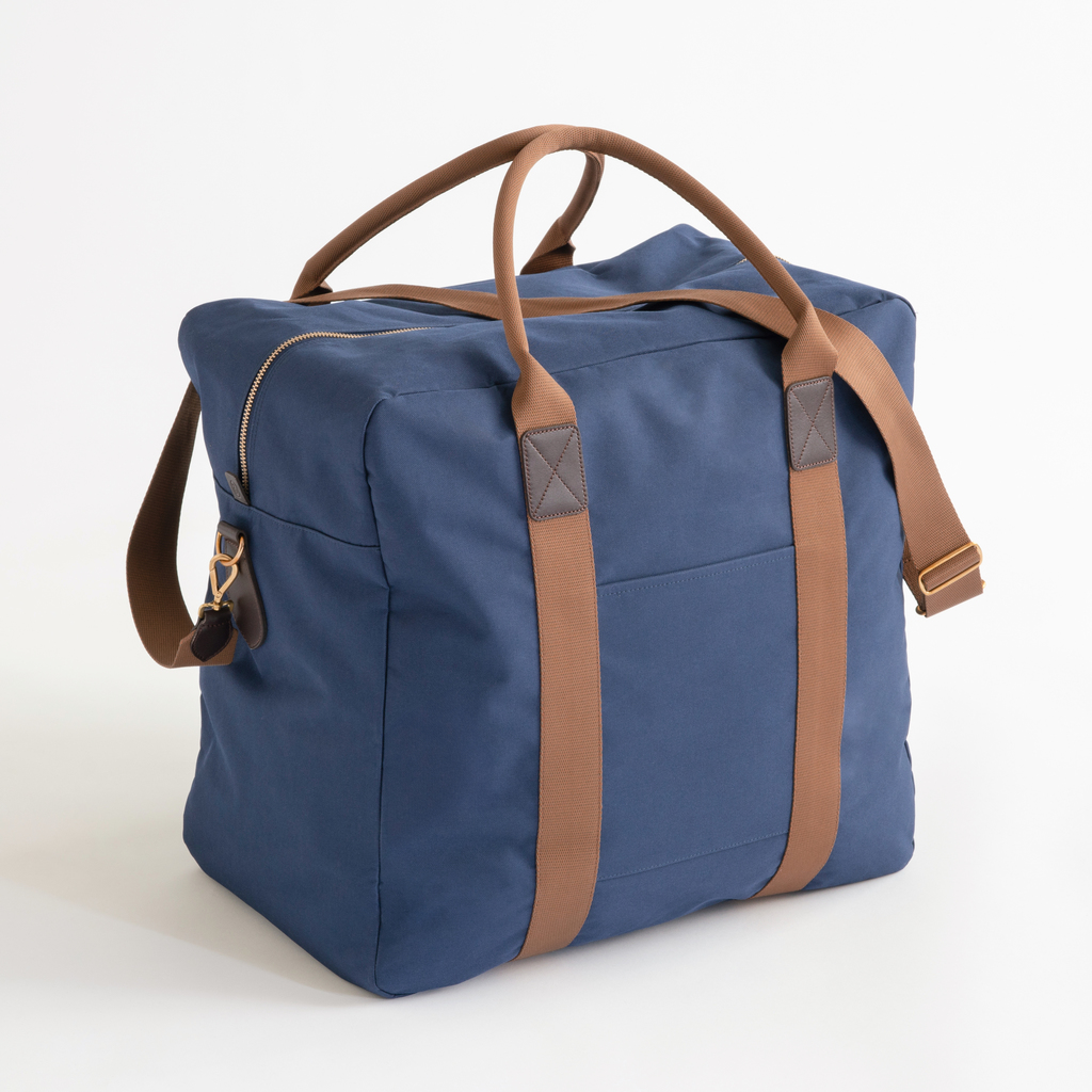 Die perfekte Reisetasche fürs Auto nutzt mit ihrem Format die Höhe im Kofferraum effektiv aus. Stellt man sie aufrecht hinein, bleibt noch jede Menge Platz für andere Reisetaschen, Weinkisten oder weitere Cargo Bags. Hergestellt aus Poly Canvas, einem Verbundmaterial aus einem feuchtigkeitsabweisenden Polyestergewebe außen und einem stabilisierenden Canvas aus 100 % Baumwolle innen. Henkel aus hellbraunem Gurtband, im Griffbereich angenehm rund vernäht. Lederbesätze, alle Metallteile aus massivem Messing. Abnehmbarer, verstellbarer Schultergurt mit Karabinerhaken. Großes Hauptfach, zusätzliches Innenfach mit Reißverschluss.