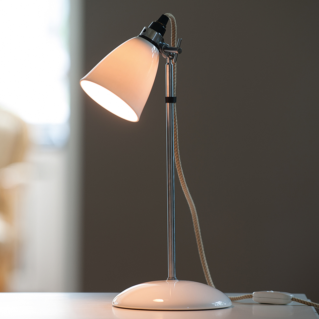 Kleine Tischlampe im Stil der 1940er/50er Jahre, ideal als Nachttischlampe oder auf einer kleinen Kommode. Fuß und Schirm aus weißem Porzellan, Schaft aus Aluminium. Die Neigung des Schirms ist über eine Klemmschraube verstellbar, der Schirm ist komplett abnehmbar. Textilkabel mit weißem Kunststoffschalter. Diese Leuchte ist geeignet für Leuchtmittel E14 R50 mit max. 40 W.