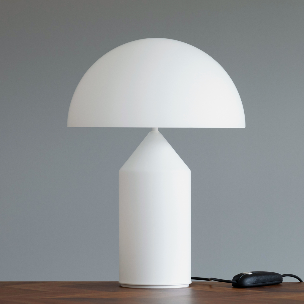 Auf simple geometrische Formen reduzierte, 1979 mit dem Compasso d’Oro ausgezeichnete Tisch- und Nachttischleuchte aus der Feder des Mailänder Architekten und Industriedesigners Vico Magistretti (1920 bis 2006), bei der Fuß und Schirm jeweils aus demselben Material hergestellt sind. Bei der aus Metall gefertigten Atollo 238 BR richtet sich der Lichtschein daher vor allem nach unten. Bei den vollständig aus mundgeblasenem, opalfarbenem Muranoglas hergestellten Lampen Atollo 236 und 237 dagegen taucht ein zusätzliches, im Fuß angebrachtes Leuchtmittel die gesamte Lampe in helles, sphärisches Licht. Von Oluce in Mailand, wo Vico Magistretti über Jahre als künstlerischer Direktor und prägender Designer tätig war.
