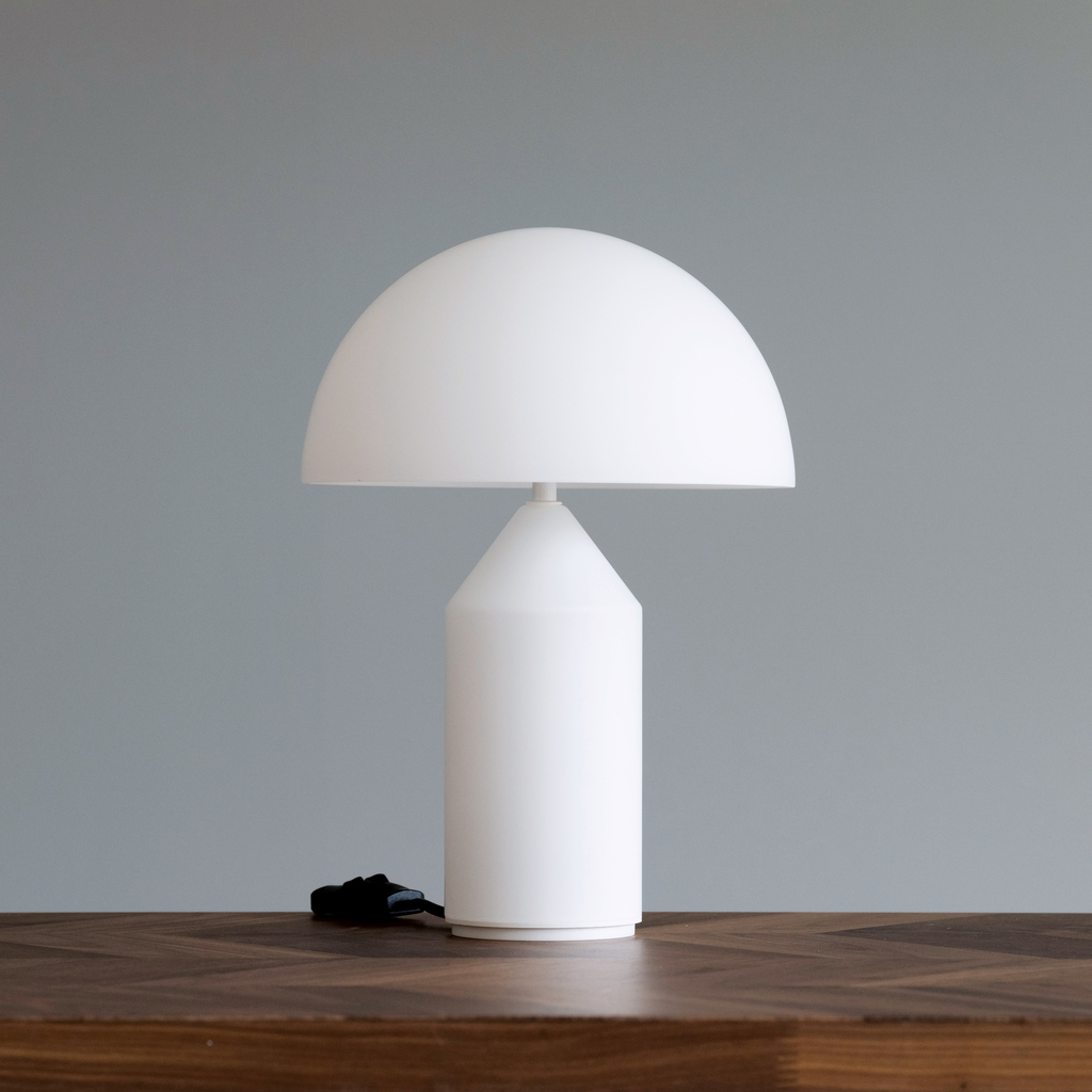 Auf simple geometrische Formen reduzierte, 1979 mit dem Compasso d’Oro ausgezeichnete Tisch- und Nachttischleuchte aus der Feder des Mailänder Architekten und Industriedesigners Vico Magistretti (1920 bis 2006), bei der Fuß und Schirm jeweils aus demselben Material hergestellt sind. Bei der aus Metall gefertigten Atollo 238 BR richtet sich der Lichtschein daher vor allem nach unten. Bei den vollständig aus mundgeblasenem, opalfarbenem Muranoglas hergestellten Lampen Atollo 236 und 237 dagegen taucht ein zusätzliches, im Fuß angebrachtes Leuchtmittel die gesamte Lampe in helles, sphärisches Licht. Von Oluce in Mailand, wo Vico Magistretti über Jahre als künstlerischer Direktor und prägender Designer tätig war.