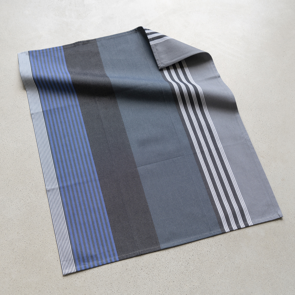Geschirrtuch aus strapazierfähigen Gewebe aus reiner Baumwolle. Um keinen Stoff zu verschwenden, werden die Tücher Stück an Stück aus dem Gewebe ausgeschnitten, das in einer Breite von 180 cm aus dem Webstuhl kommt – das Streifenmuster ist daher bei jedem Tuch unterschiedlich positioniert.