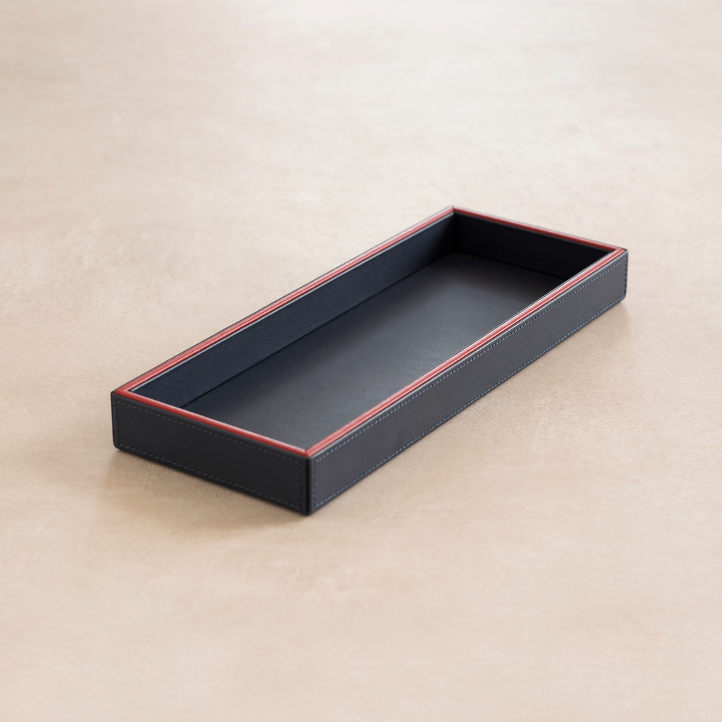 Stiftablage mit sehr hochwertiger Anmutung, die sich in jeden Einrichtungsstil wunderbar einfügt, ohne sich in den Vordergrund zu drängen. Die sichtbaren Flächen sind jeweils mit dunkelblauem Leder bezogen und mit roten Kanten versehen – das Material fasst sich angenehm an und altert schön. Die Unterseite ist mit rutschhemmendem, angerautem Kunstleder belegt. Flache, rechteckige Ablage mit niedrigem Rand.