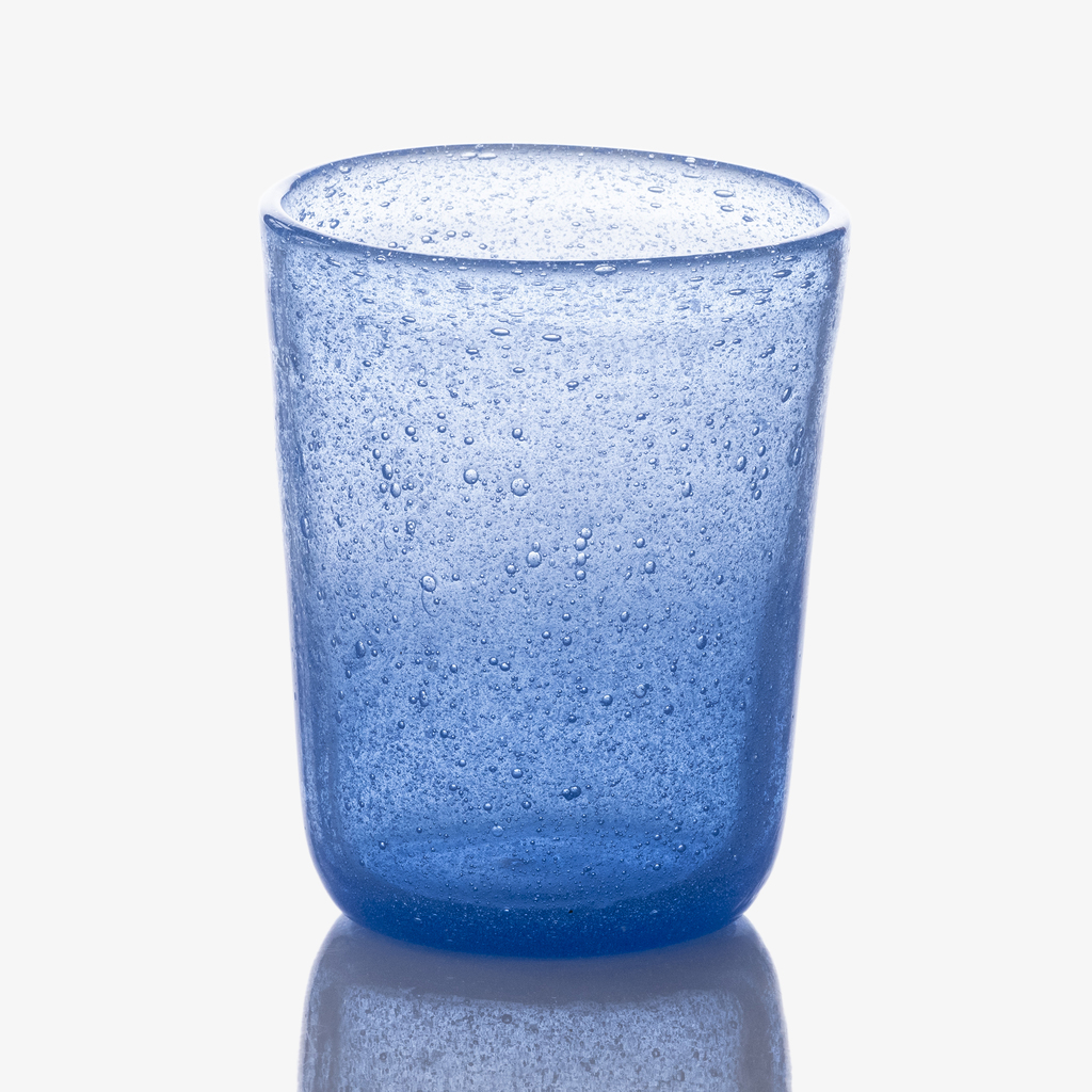 Trinkgläser in strahlenden Farben und mit Tausenden ins Glas eingeschlossenen Luftbläschen. Die Herstellung ist aufwendig: Es handelt sich um Überfangglas, bei dem der Glaskörper aus klarem Glas mit einer weiteren Schicht farbigen Glases überzogen wird, was zu besonders leuchtenden Farben führt.