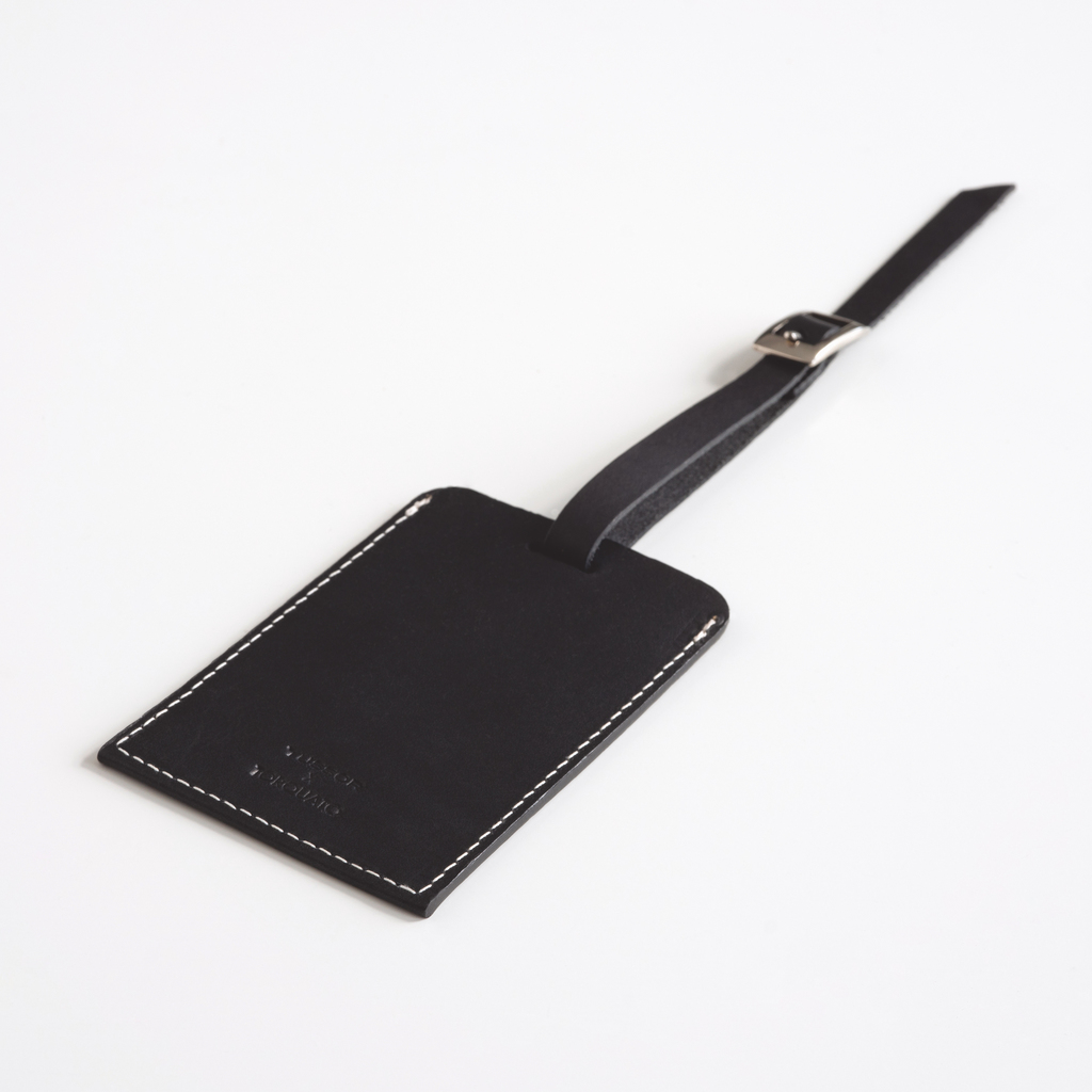 Diese Gepäckanhänger aus vollnarbigem, durchgefärbtem Kalbsleder werden vom französischen Lederatelier Tussor im Beaujolais nach alter Handwerkstradition gefertigt. In das flache Etui ohne Sichtfenster lassen sich Visitenkarte oder Adresskärtchen einschieben und bei Bedarf diskret zum Lesen herausziehen. Zum Befestigen am Gepäckgriff dient ein Riemchen mit Metallschnalle. Das nach dem Färben unbehandelte Leder entwickelt mit der Zeit eine schöne Patina. Schwarz versiegelte Kanten.