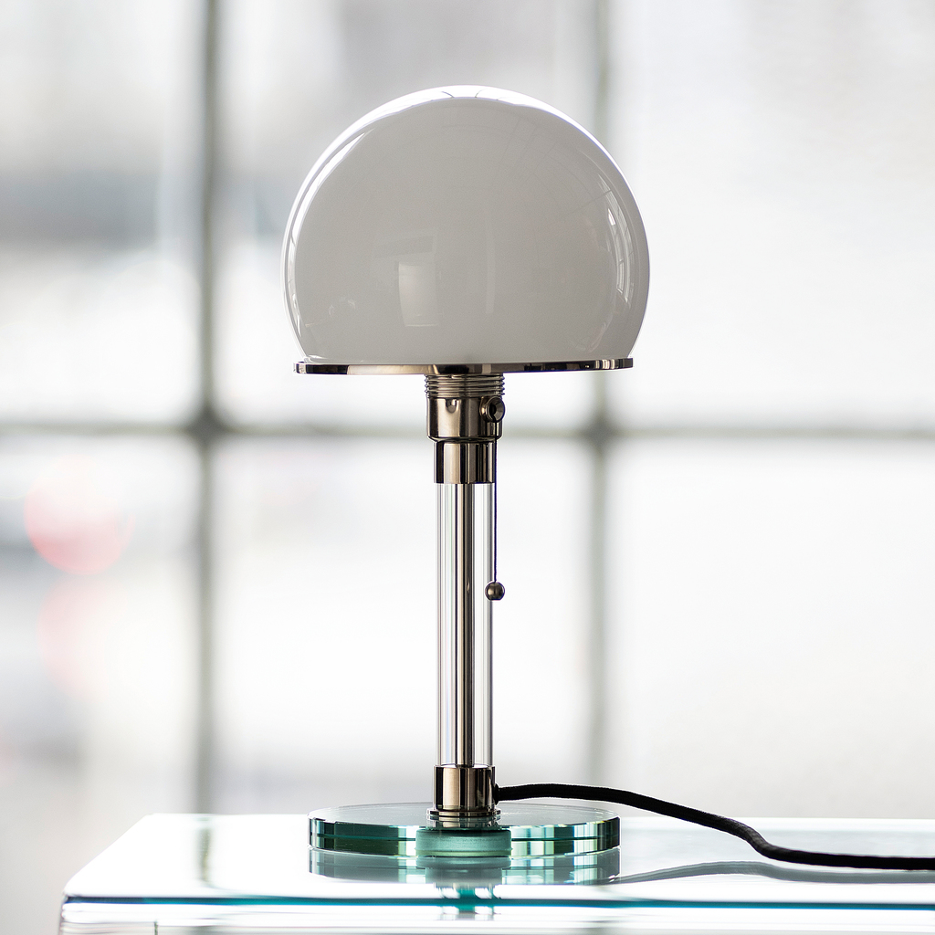 In ihrer endgültigen, von Wilhelm Wagenfeld 1924 vollendeten Form offenbart diese Leuchte die typischen Gestaltungsprinzipien des Bauhauses: die Verwendung industrieller Werkstoffe wie Metall und Glas, die Kombination der Grundformen Kreis, Kugel und Zylinder sowie die Sichtbarkeit ihrer technischen Funktion. Seit 1980 entsteht die Tischleuchte WG 24 bei Tecnolumen in Bremen in einer nummerierten und von Wilhelm Wagenfeld lizenzierten Edition. Fuß aus Klarglas und vernickeltem Metall, Schirm aus opalüberfangenem Glas. Textilkabel und Schalter mit Zugband. Für Leuchtmittel E27, max. 75 W (nicht enthalten).
