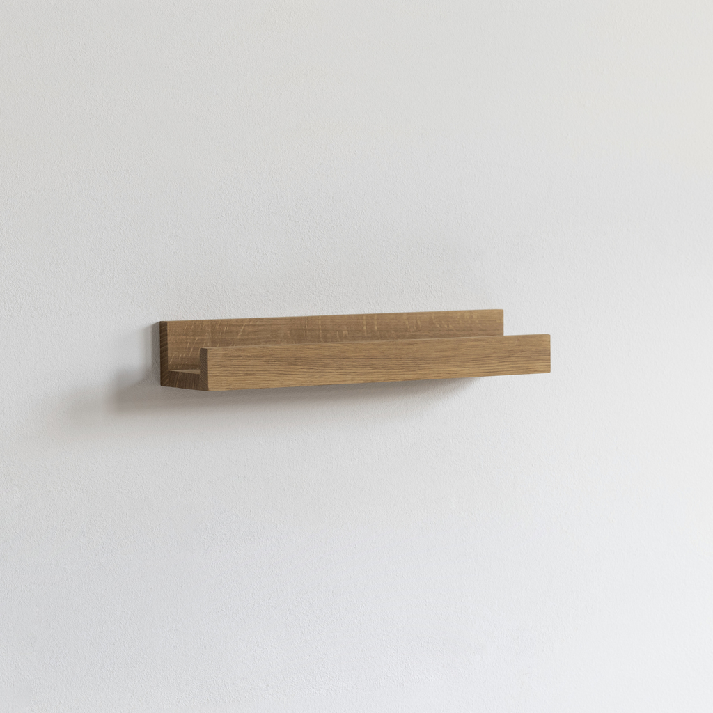 Schlicht, natürlich und zurückhaltend gezeichnete Regale aus geöltem, PEFC-zertifiziertem Eichenholz. Ein niedriger Rand an der Vorderseite verhindert ein versehentliches Herunterrutschen von auf dem Regal abgestellten Gegenständen. Es eignet sich daher nicht nur zur funktionalen Aufbewahrung, sondern auch als Dekorelement und zur Präsentation von kleinen Sammlerstücken. Zwei bündig eingelassene Schlüssellochaufhänger aus Metall, Lieferung ohne Schrauben.