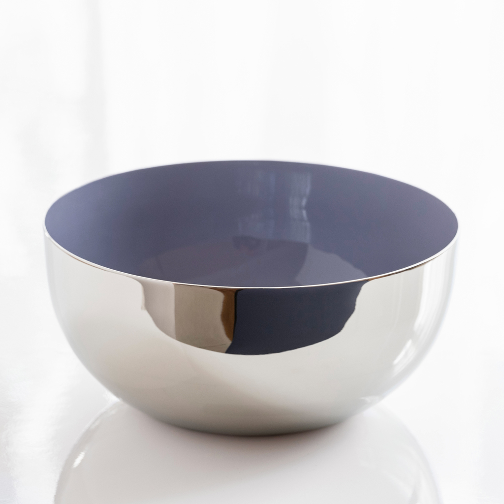 Schlichte Schalen aus massivem Messing, die innen mit einer Schicht aus Kaltemaille überzogen und außen vernickelt sind. Kaltemaille findet sich ansonsten vor allem in der Schmuckherstellung, wo normalerweise nicht mit heißer Glasschmelze gearbeitet werden kann. Die Farbpigmente werden hier zusammen mit hochwertigem Kunstharz verarbeitet, wie man es z. B. von teuren Schreibgeräten kennt. Solcherart hergestellte Kaltemaille lässt sich außerordentlich glatt verarbeiten und bietet einen herrlichen, tiefen Farbglanz. Die Außenseite ist hochglanzpoliert, mit einer Schicht Schutzlack überzogen und zeigt den für Nickel typischen, sich von Chrom oder Silber durch eine minimal wärmere Nuance abhebenden Farbton.