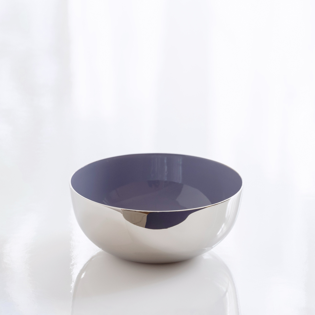 Schlichte Schalen aus massivem Messing, die innen mit einer Schicht aus Kaltemaille überzogen und außen vernickelt sind. Kaltemaille findet sich ansonsten vor allem in der Schmuckherstellung, wo normalerweise nicht mit heißer Glasschmelze gearbeitet werden kann. Die Farbpigmente werden hier zusammen mit hochwertigem Kunstharz verarbeitet, wie man es z. B. von teuren Schreibgeräten kennt. Solcherart hergestellte Kaltemaille lässt sich außerordentlich glatt verarbeiten und bietet einen herrlichen, tiefen Farbglanz. Die Außenseite ist hochglanzpoliert, mit einer Schicht Schutzlack überzogen und zeigt den für Nickel typischen, sich von Chrom oder Silber durch eine minimal wärmere Nuance abhebenden Farbton.