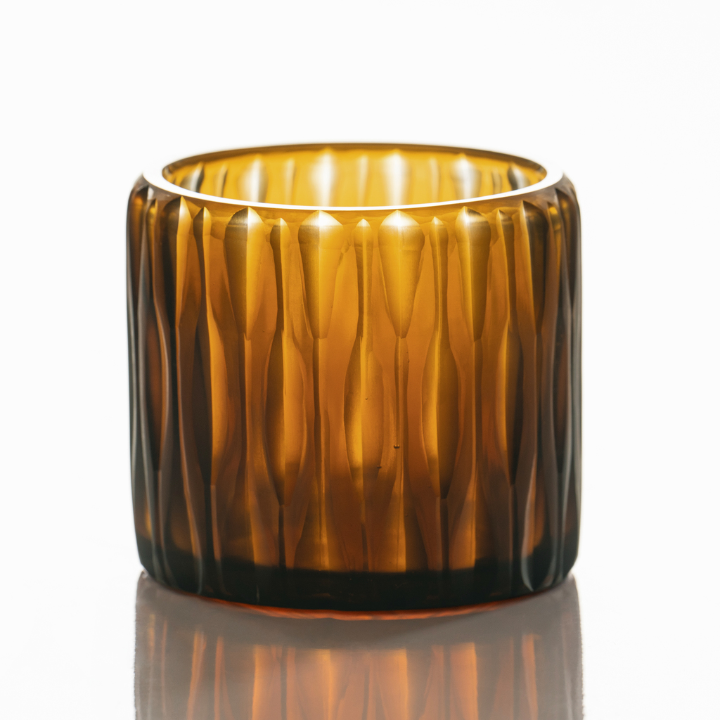 Ein warmes honigfarbenes Licht verbreitet sich aus diesen mundgeblasenen Windlichtern, deren linsenförmig eingeschliffene Rillen für ein lebendiges Spiel der Kerzenflamme sorgen. Der markante Glasschliff ist reine Handarbeit. Dadurch fallen die Rillen in ihrer Tiefe und Breite immer leicht unterschiedlich aus, so dass jedes Windlicht ein individuelles, organisches Dekor aus hellem und dunklem Glas erhält.