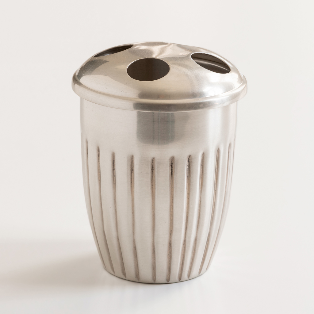 Für diese sechsteilige Badezimmerserie aus versilbertem Messing stand eine Teekanne im Queen-Anne-Stil Pate mit der markanten, sich aus dem Boden entwickelnden Rillenprägung und der sich in elegantem Schwung nach unten verjüngenden Form. Obgleich Queen Anne Stuart das britische Königreich schon zu Beginn des 18. Jahrhunderts regierte, fand der ihr zugeordnete Stil erst im letzten Viertel des 19. Jahrhunderts in England und Amerika seine weiteste Verbreitung.
