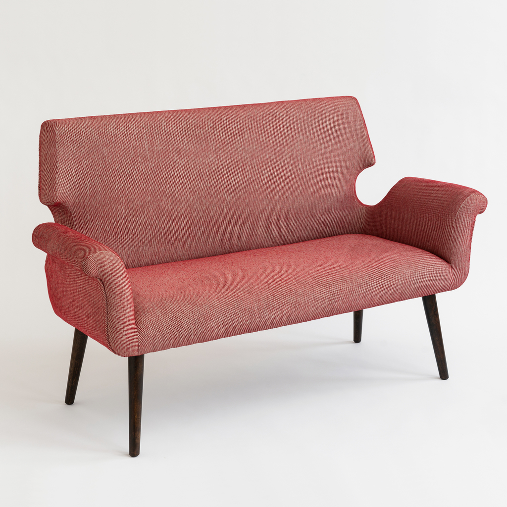 Zweisitzer im Stil der 1950er/1960er Jahre mit für die Zeit typischen schlanken, konisch zulaufenden, leicht ausgestellten Holzbeinen. Eine angenehm feste Polsterung, auf der man bequem sitzt, ohne zu tief einzusinken, macht solche Möbel für Hotelhallen oder Bars zur ersten Wahl. Zu Hause eignen sie sich gut für kleinere Räume. Die solide Holzkonstruktion mit mehrlagiger Polsterung ist wahlweise mit rubinrotem Samt oder mit einem strukturierten Stoff in zeitlosem „Salt and Pepper“-Muster bezogen. Auffällige Kedernähte um Sitzfläche und Rückenlehne betonen die Kontur.